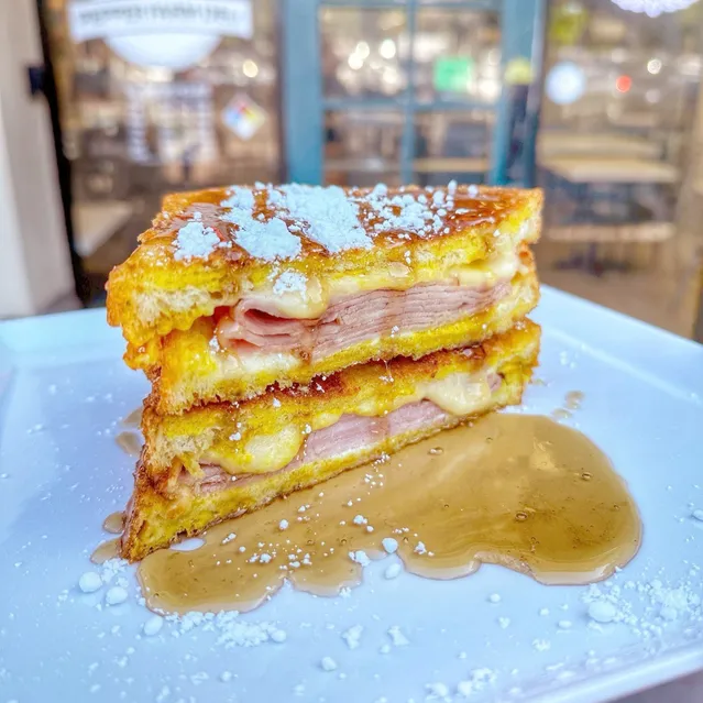Oven-roasted ham, havarti cheese, mustard, mayo, on egg batter-dipped white bread, pan fried and garnished with powdered sugar!
