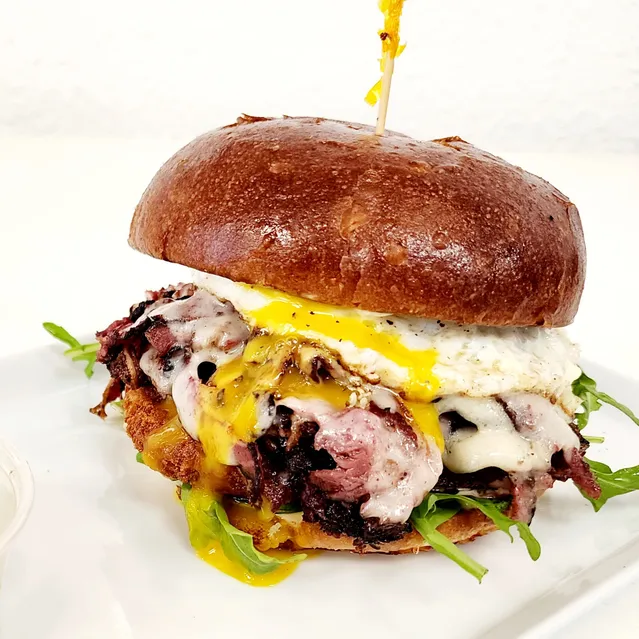 Brioche bun, pastrami, sunny-side up egg, Swiss cheese, arugula, thousand island dressing, garlic aioli, hash-brown with a dash of organic maple syrup